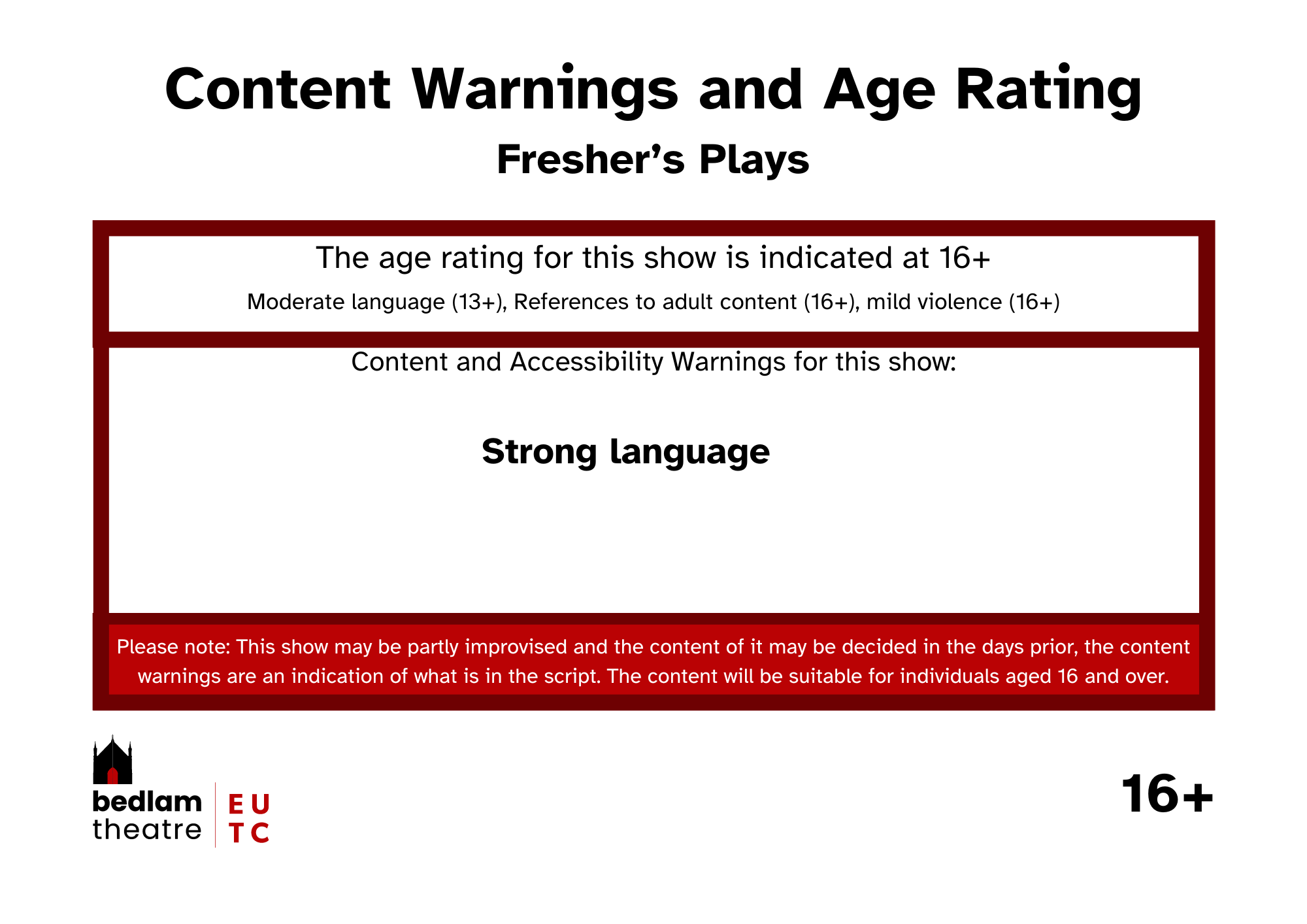 Please note: This show may be partly improvised and the content of it may be decided in the days prior, the content warnings are an indication of what is in the script. The content will be suitable for individuals aged 16 and over.